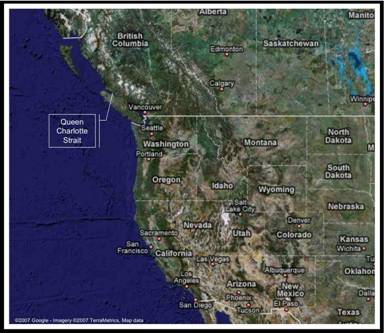 Queen Charlotte Strait, location of fish farms in the Broughton Archipelago