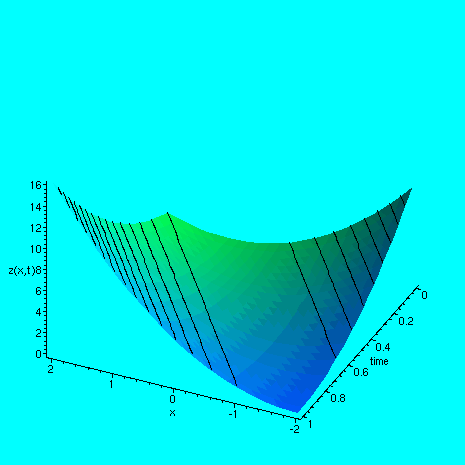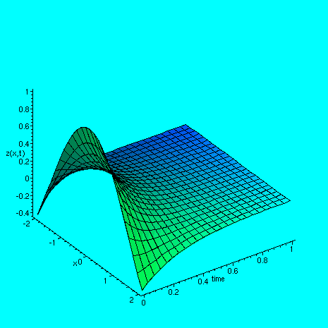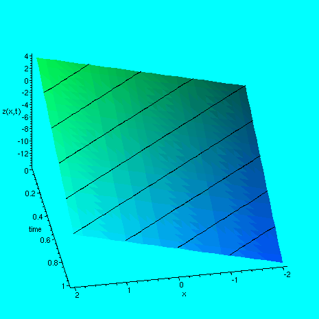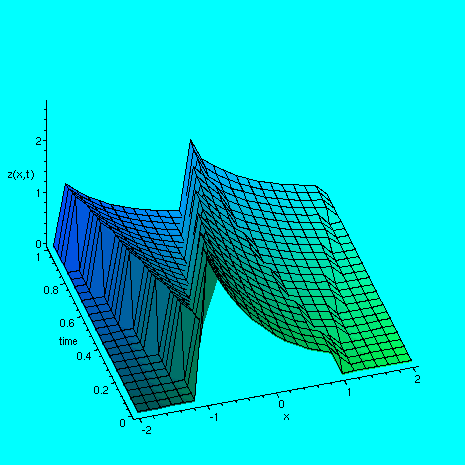 > plot3d( f3(x,y), x=-2..2, y=0..1, labels =[`x`, `time`, `z(x,t)`], axes=FRAMED, style=patch);