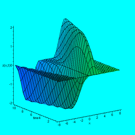 > plot3d( u(x,y), x=-8..8, y=0..10, labels =[`x`, `time`, `z(x,t)`], axes=FRAMED, style=patch);