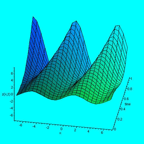 > plot3d( f4(x,y), x=-7..7, y=0..1, labels =[`x`, `time`, `z(x,t)`], axes=FRAMED, style=patch);